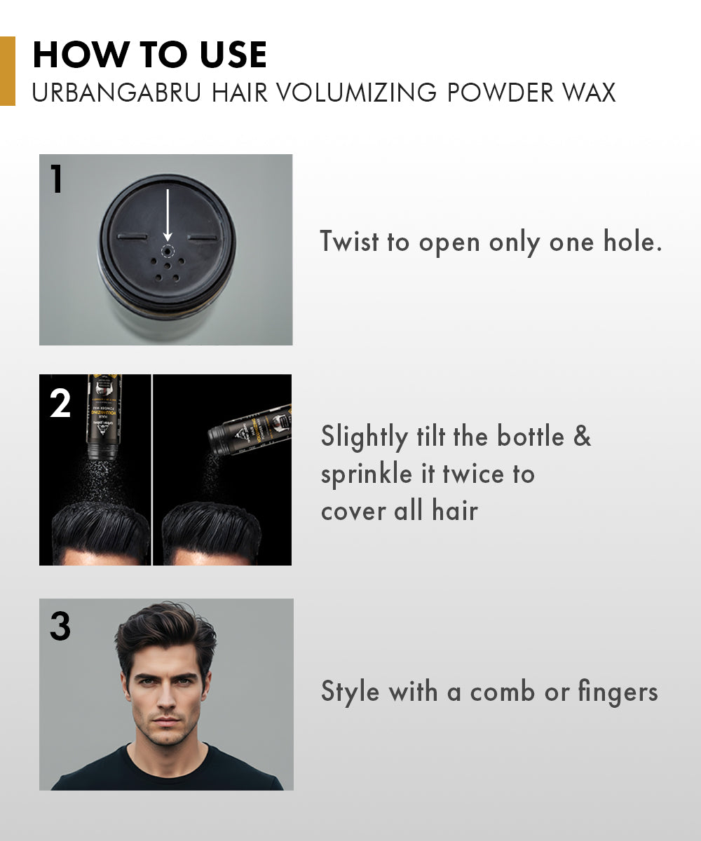 UrbanGabru Hair Volumizing Powder Wax is specially innovated with natural ingredients such as Aloe Vera Powder, Argan Oil, and Keratin so that you can style your hair every day without damaging them. Aloe Vera Powder helps to strengthen the hair and minimize greasiness. Argan Oil nourishes the scalp and hair. Helps in reducing hair breakage, and split ends and helps in minimizing hair loss and improving hair density. While Keratin plays a role in smoothening and straightening hair.